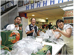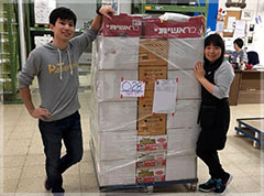 スタッフ皆で手分けして、食料などパレット積みし、完了後にスタッフで囲み、支援先の方々の祝福を祈って送り出します。また、個人手渡し用の食料も流れ作業で小分けにしていきます。どの作業も手際よく流れました。