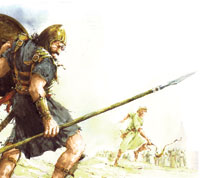 ゴリヤテに立ち向かう少年ダビデダビデはゴリヤテの大きさに少しもひるみませんでした。しかし、ゴリヤテの不遜な態度に憤慨します。不敵にも神をあざけるとは!ダビデはサウルに語りました。「あの男のために、だれも気を落としてはなりません。このしもべが行って、あのペリシテ人と戦いましょう。」(Ⅰサムエル17:32)