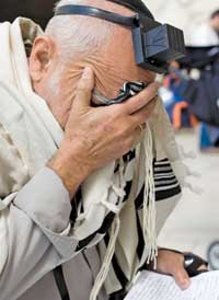 額にテフリンを付け、ツィツィートを被って祈るユダヤ教徒の男性