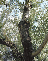 オリーブの古木に接ぎ木されて伸びた若枝(右下の白っぽい枝)