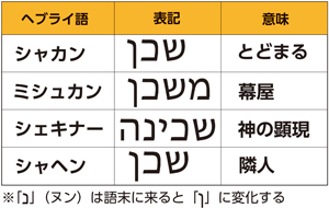 神は、地上に御名をとどまらせる(住まわせる)場所を持ちたいと願われました。その願いを表す言葉としてタナハ(創世記〜マラキ書)で使われているのが、シャカンです。主が幕屋の建設について指示を与えた申命記にも出てきます。神は明確に「あなたがたの神、主が、御名を住まわせる(シャカン)ために選ばれる場所(幕屋)」(申12:11a、強調・追加筆者)と言われました。