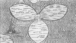 イスラエルが中心に書かれた世界地図「いと高き方が、国々に、相続地を持たせ、人の子らを、振り当てられたとき、イスラエルの子らの数に従って、国々の民の境を決められた。主の割り当て分はご自分の民であるから、ヤコブの相続地である。」(申命32:8-9)。