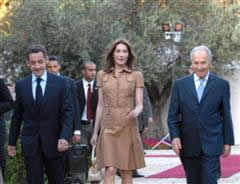(写真:イスラエルを公式訪問するフランスのサルコジ大統領夫妻・右端はイスラエルのペレス大統領)