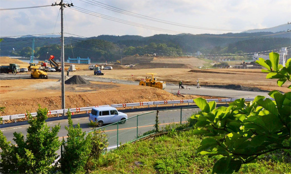 宮城県を移動する中、至る所で高台整地の工事が進んでいました。山はまるで上から刃物をおろしたように切り出され、高台から見下ろす沿岸のあちこちが盛土で埋め尽くされているかのようでした。一般道路は工事用大型車両が連なり、大忙しの様子です。現地の方から聞くと「復興住宅が完成し入居が始まっている地域はある。しかし高台移転の地域は、いまだに平地確保や整地にてこずっている。今年の冬も仮設住宅に住まう覚悟をしている。唯一の住まいである仮設住宅は傷みが進み、修繕箇所が増えている。でも、職人さんや機材が足りなくて修繕が追い付かない。でもみんな我慢しているのだから……。」とのこと。現状を訴えることさえはばかる苦しい状況がそこにはありました。しかし、少しずつでも地域全体が前に進んでいる、復興へ向かっていることも事実です。