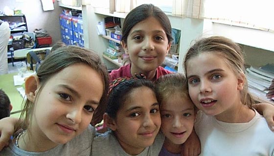 隣接するアダヤフー小学校では、給食の時間に2年生のクラスを訪れました。この日の給食はファラフェル(ヒヨコマメの揚げ物、フムス、野菜をピタパンにはさんだもの)。写真を撮る私を囲むように子どもたちが集まってきました。子どもの純粋さと好奇心は万国共通です。