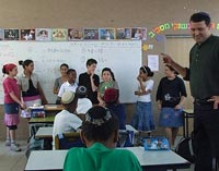 へブライ語の歌を歌うために並ぶ5年生とアヴィグドール校長